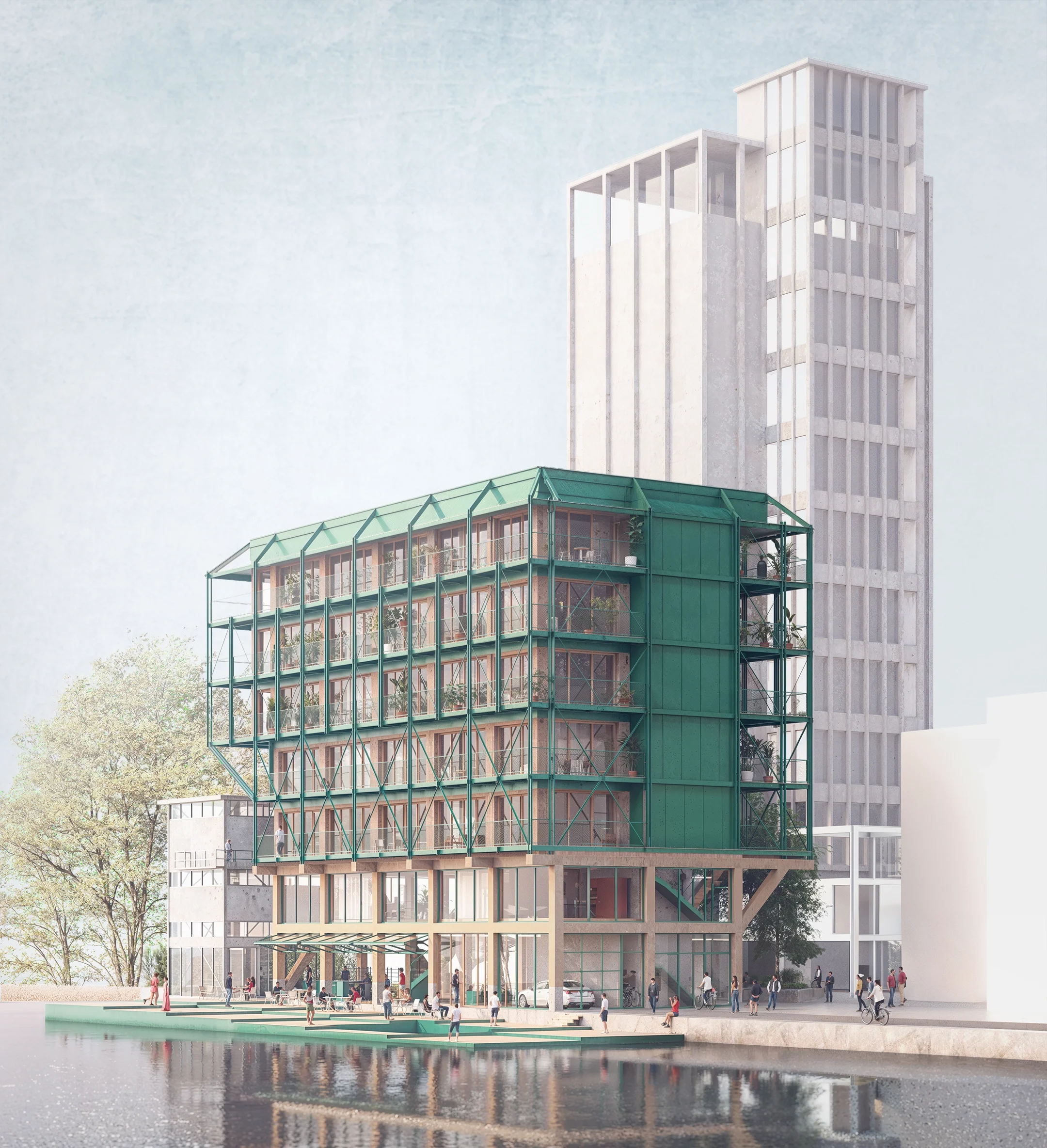 The steel shell references the industrial heritage of the harbour—cranes, frames and structures—while its green colour and fine-grained composition give the building a contemporary and humane character. The façade is deliberately legible: different housing types and functions are reflected in varying steel profiles, diagonals and rhythms.